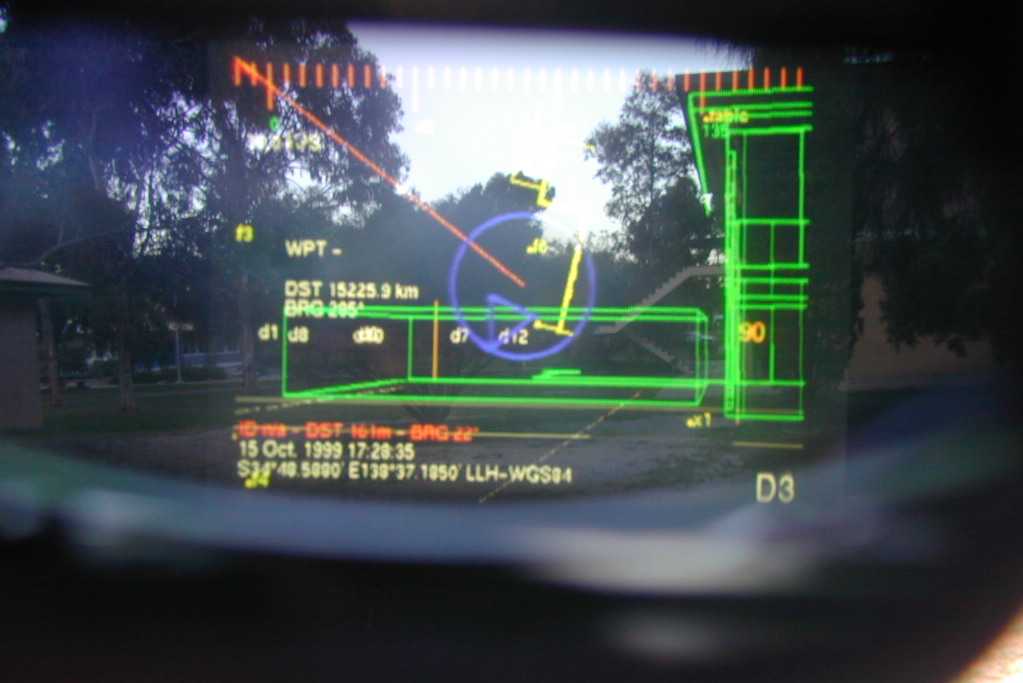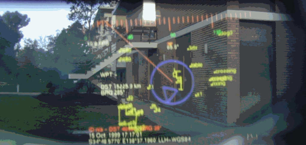 At the top of the display is the compass heading, which is represented as notches and a value every 45 degrees. As the user rotates their head, the compass updates itself and scrolls left or right to indicate the new heading. The various pieces of text information placed around the display are used to show position, GPS accuracy, and steering instructions to the nominated waypoint.