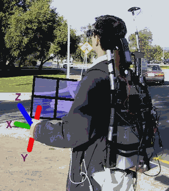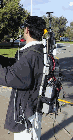So, to perform our research, we have built up a wearable computer [MANN96, BASS97] based around a standard PC laptop, mounted on a backpack. When walking around outdoors, traditional components such as big displays and keyboards are all useless, and so these have been replaced with more exotic components such as a GPS receiver, 3-axis magnetic compass, head mounted displays, and custom built input devices.