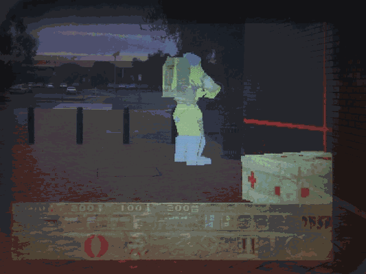 The figure above shows one such example, showing the edge of the building on the right, and the computer has overlaid the wireframe in green over the top. In the centre of the display is a green box, which was used to visualise an extension to a lecture theatre at UniSA. The wireframe is useful for overlaying on real objects, but not very useful for visualising non-existent objects. As a result, a solid renderer is used to produce better displays and was introduced in Tinmith evo4. The rest of the screen components will be explained in a later subsection.