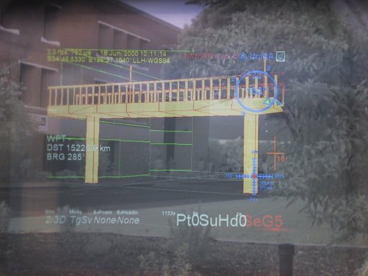 The figure above shows the scene outdoors through the HMD. Notice the green wireframe outline does not line up to the building once again. Also note the limited area that the display can actually draw on, the field of view of most HMDs is quite small.