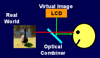 Instead of using standard optics like in opaque HMDs, these use a half-silvered, optical combiner mirror. The image from the LCD display is still shown to the user as before, except now the mirror also allows light from the real world. The end result is a ghosted image where you can see the physical world but also computer generated imagery, as shown in the figure below.