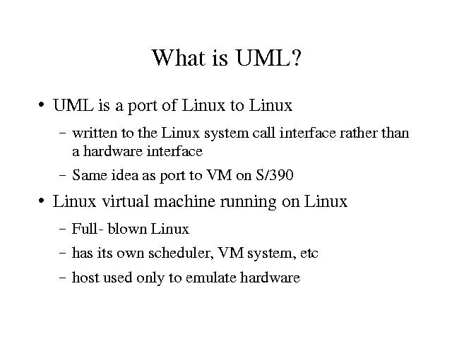 UML is a port of the Linux kernel to the Linux system call interface. This is not a particularly obvious idea, but it has already been done, notably with the Linux/S390 port, which is a port of Linux to VM.