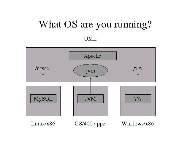 The host MySQL database is mounted inside UML on /mysql. The OS/400 JVM is represented inside UML as a process. Maybe Java is fed into the 'jvm' stdin and output grabbed from its stdout. Whatever Windows resources are desirable are either mounted as filesystems or represented as processes. The Apache running inside UML has local, native access to Linux, OS/400, and Windows data, resources, and applications.