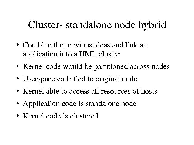 The UML library and clustering ideas can be combined to allow normal applications to be clustered fairly transparently. They will be clustered to the extent they use kernel functionality.