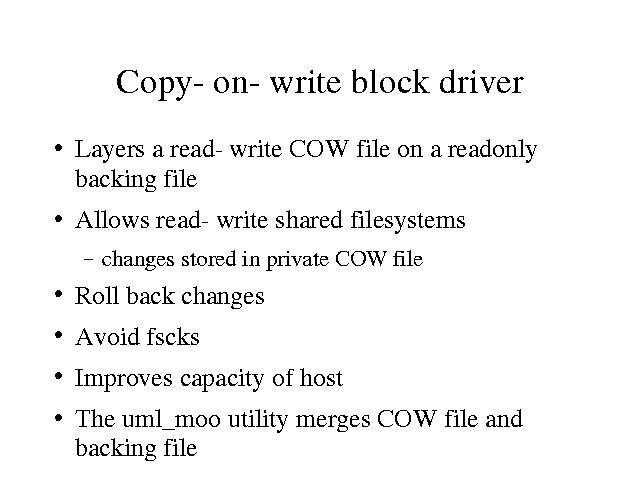 The COW block driver is a major enhancement to UML. It allows a block device to exist in two files - a readonly shared backing file and a read-write private COW file.