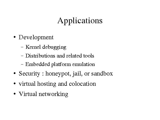 Security applications are another large area. It will soon be used as the basis of a honeypot network and the honeynet.org project is planning on using it as part of its virtual honeynet project. It is also being used to jail services, such as bind and sendmail, which are not well-trusted. Potentially, it can be used in applications, such as web browsers, which need to execute untrusted code in a secure environment.